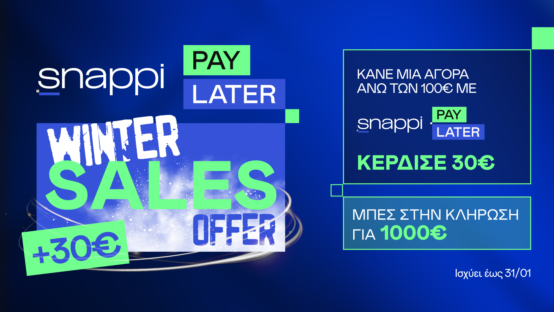 - Όλοι οι πελάτες της Snappi που θα πραγματοποιήσουν μία ή περισσότερες συναλλαγές μέσω Snappi Pay Later αξίας €30 ή άνω κατά τη διάρκεια του Διαγωνισμού (16/01- 31/01), συμμετέχουν σε κλήρωση για την ανάδειξη ενός (1) νικητή που θα κερδίσει 1000€ τα οποία θα πιστωθούν στον Snappi λογαριασμό του.